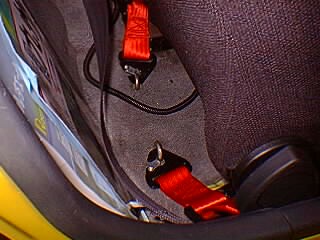 4点ベルトの下側のアンカー。iボルトは床に穴を開けて取り付ける。後でロールバーを取り付けるかもしれないので、通常の位置よりやや内側に取り付けた。 |