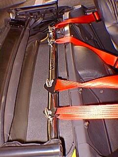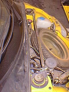 フロントストラットタワーバー。他の多くの方がレポートしているのと同様に、かなり車体の剛性があがった。シートタワーバーと同時に取り付けたので、単体での効果は不明。路面のギャップなどを拾ったときの応答性やタイヤがスライドするような限界近くの操作性が格段に向上。 |